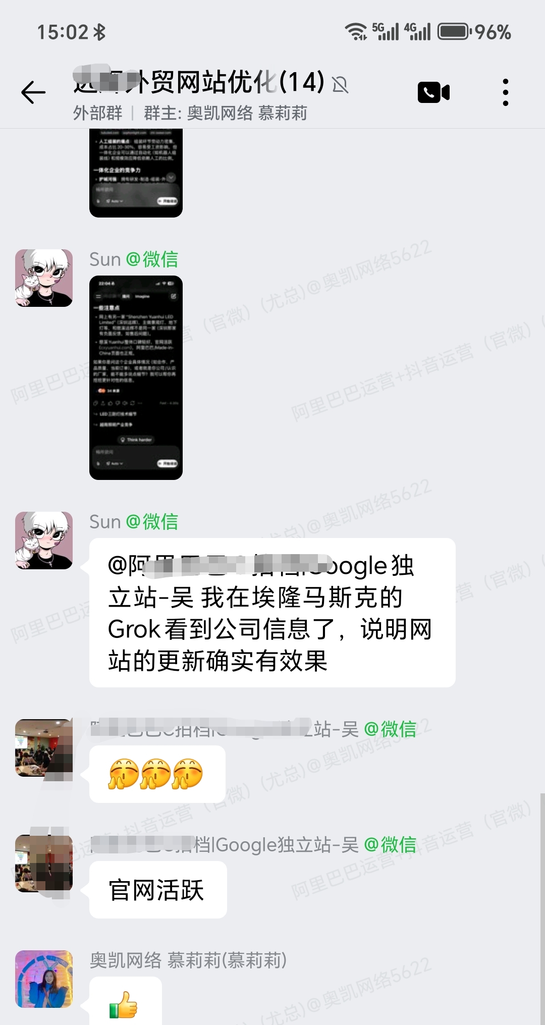 网站不但在搜索引擎中有良好的排名表现,且随着我们不断在网站更新信息,且同时也把信息同步到各社媒平台。随着各平台信息内容的不断叠加,众多信息也被?ChatGPT、?Gemini等AI平台信息收录且被正向推荐,现今又被马斯克的Grok收录,孙总自然也特别高兴。大半夜在我们网站运营的服务群里,发来表扬信息。